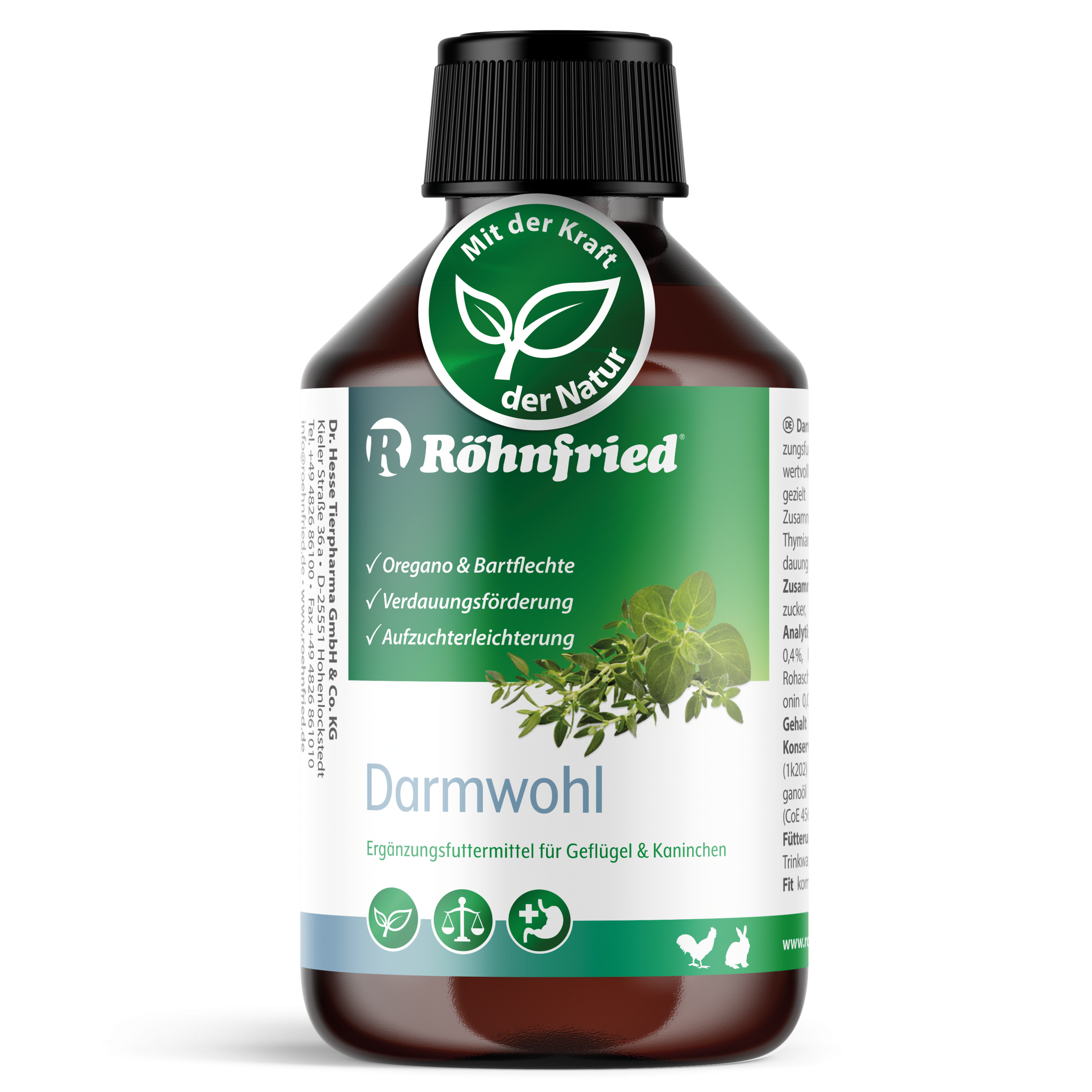 DARMWOHL 250 ml je vodotopivi dodatak prehrani koji sadrži origano i Usnea barbata, koji promiče zdravlje crijeva i olakšava reprodukciju kunića , peradi i malih životinja.