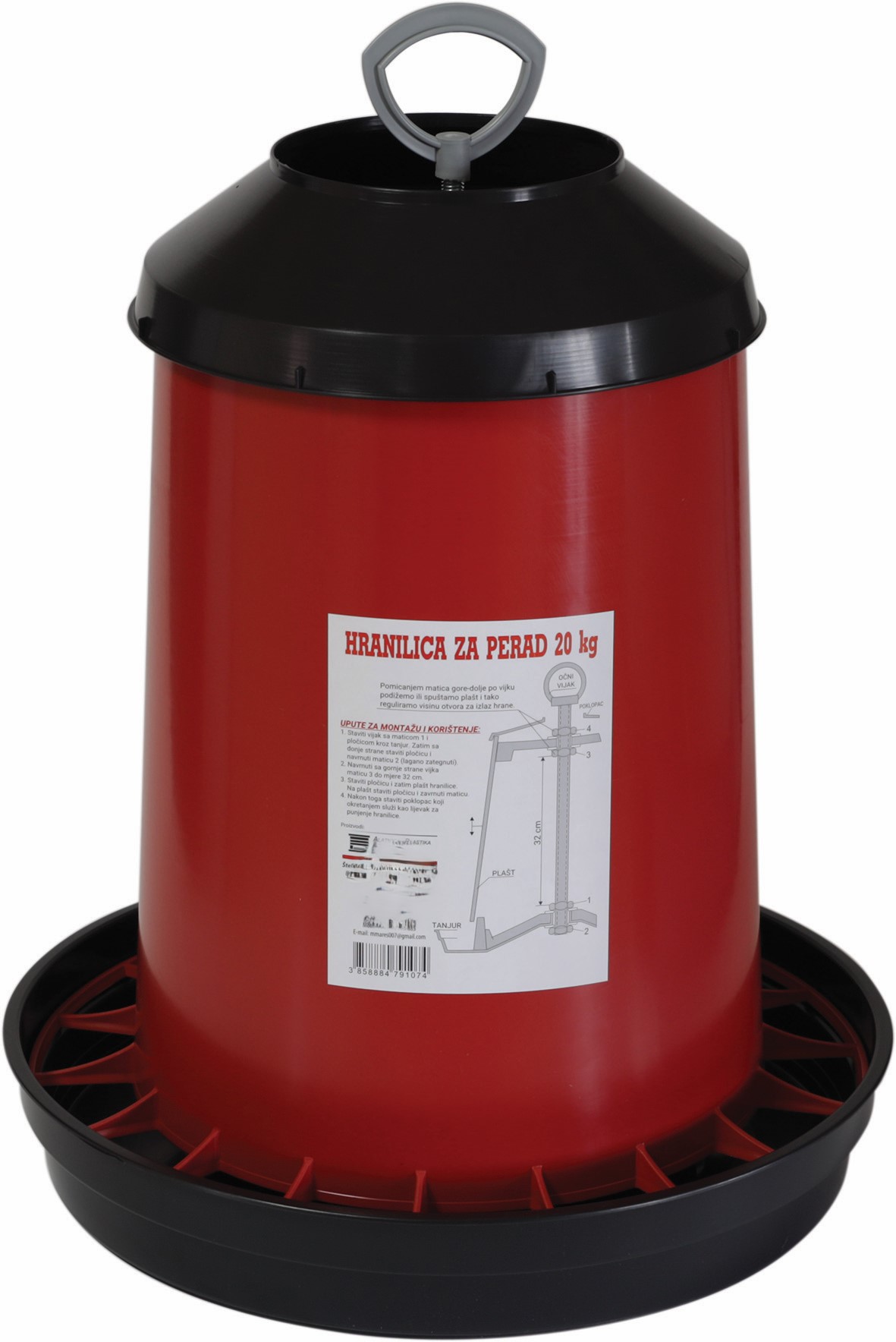 Hranilica za perad 20 kg – najveća hranilica iz našeg programa za perad svojim kapacitetom i robusnom konstrukcijom pogodna je za najzahtjevnije zadatke kod uzgoja pilića, pačića, pura i gusaka. Opremljena poklopcem posebno dizajniranim za lakše dodavanje hrane, te uz mogućnost podešavanje visine za preciznije doziranje smjese ova hranilica je odličan izbor za svakog uzgajivača peradi. Čvrsta navojna šipka s maticama i podlošcima od pocinčanog čelika osigurava korištenje i u najzahtjevnijim uvjetima. Primjenjuje se kao ovješena ili samostojeća hranilica.